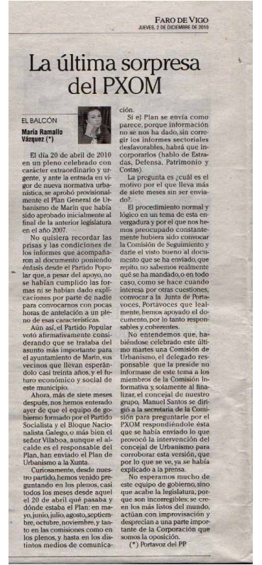 Dous meses despois, en febreiro de 2011, o Valedor do Pobo dirixiuse aos veciños e veciñas que tramitaron a instancia para respostar conforme as competencias que ten asignadas. O Valedor do Pobo daba por válida a actuación do Concello de Marín no que respecta ao procedemento de información pública do proxecto de PXOM de Marín; mais consideramos que o seu enfoque está errado posto que o motivo da protesta contra o Concello non atinxe á xestión do PXOM, senón ao feito contrastado de que nin o alcalde, nin ningún cargo no que delegue, recibiu en todo este tempo a unha representación de DEFENDE O MONTE PITUCO para explicar os criterios que motivaron a elección desa zona como chan industrial, nin para escoitar os argumentos (técnicos, medioambientais, patrimoniais) desta asociación que desaconsellan semellante decisión.