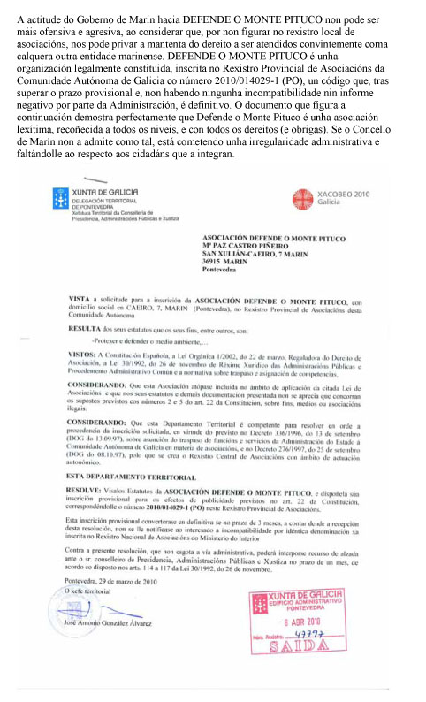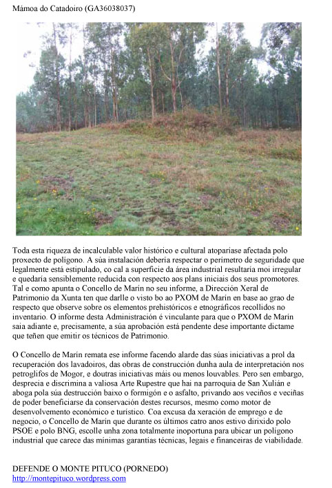 O pasado mes de decembro de 2010, algúns de vostedes foron partícipes das queixas que, dende DEFENDE O MONTE PITUCO (PORNEDO), se lle dirixiron ao Valedor do Pobo para protestar pola actitude do alcalde de Marín, Francisco Veiga, e do seu equipo de Goberno coaligado PSOE-BNG, que dende abril dese mesmo ano non atenderon ningunha das numerosas peticións de entrevista que se lle presentaron formalmente para cuestionarlle a elección do Monte Pituco como futura ubicación dun polígono industrial. Dende este colectivo veciñal queremos agradecer a solidariedade das persoas que contribuíron a formular esta queixa ante a oficina do Valedor do Pobo para deixar constancia da situación de indefensión que padecemos ante o desprezo reiterado por parte das instancias municipais.