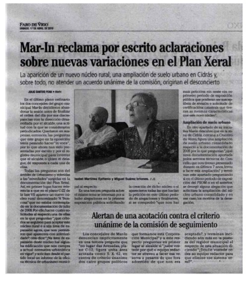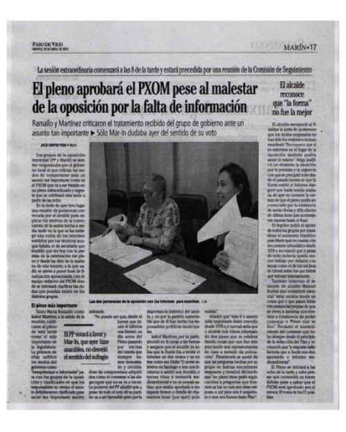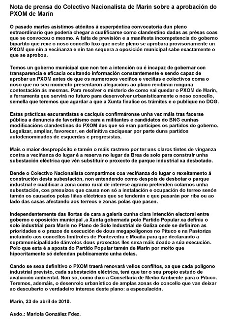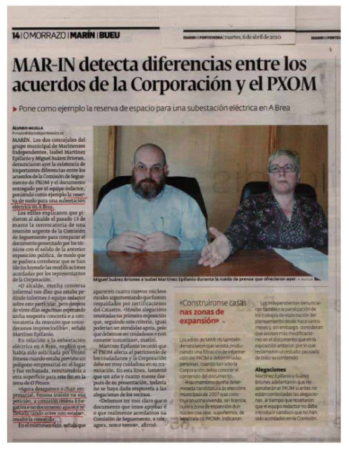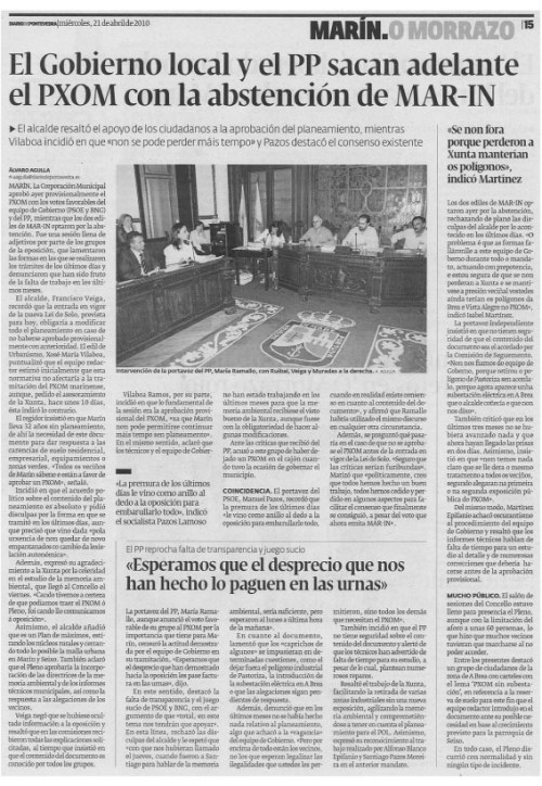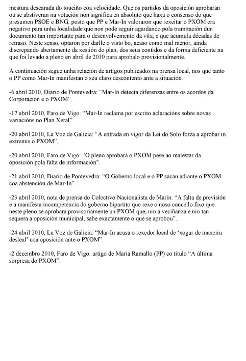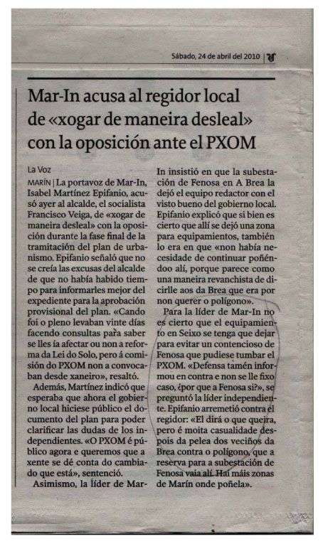 O motivo desta carta, así pois, é aclarar o que desde o Concello se intentou terxiversar con ese informe. En vésperas dunhas eleccións municipais que van ser decisivas para o futuro de Marín, rexeitamos as maneiras reviradas dos actuais responsables municipais e a súa falta de diálogo cos veciños afectados polas súas medidas. Apelamos á “democracia real” que a cidadanía está pedindo xa nas rúas e nas prazas das principais cidades de Galicia e do resto de España. Os veciños e veciñas de Marín merecemos algo mellor: gobernantes que nos atendan correctamente cando teñamos un problema; gobernantes que non nos pechen as portas do Concello cando precisemos explicacións; gobernantes que nos respecten xa non só como contribuíntes, senón como iguais.