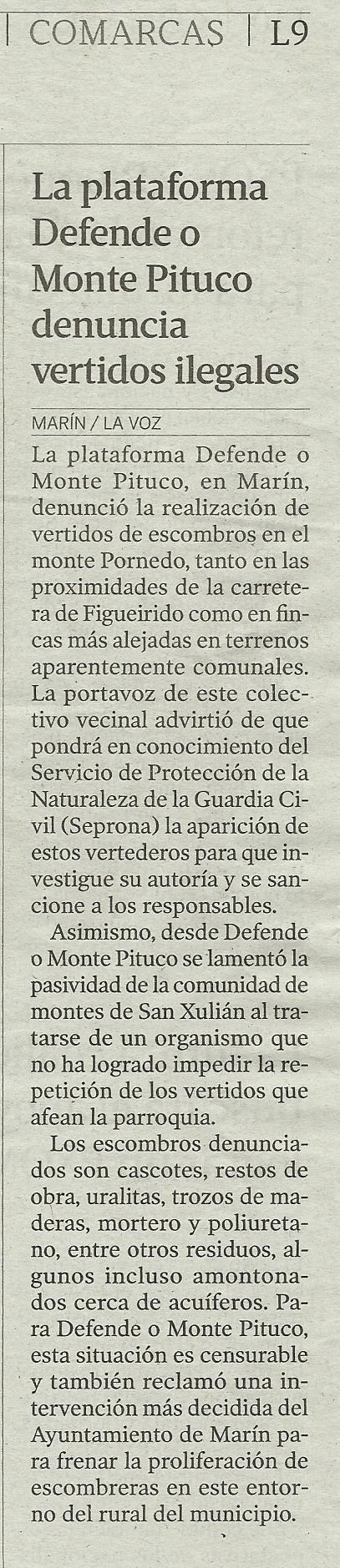 Na edición dixital da edición de Pontevedra de La Voz de Galicia: “La Plataforma Defende o Monte Pituco denuncia vertidos ilegales“.