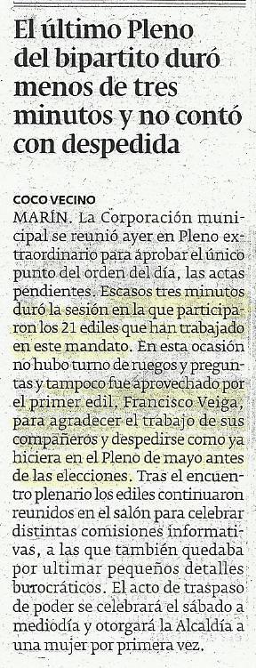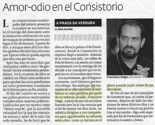 Pola sombra, e con vento fresco. Porque xa lle vai sendo hora de superar a fase de “negación” (…Como puiden perder as eleccións, se fun máis mellor alcalde do mundo mundial! –pensaría na noite do 22-M) subseguinte ao resultado electoral máis que inapelable. Esfumouse aquel “bo-rollismo” que desprendía Francisco Veiga dende o sillón presidencial na sesión de maio, agradecendo o traballo da Corporación e despedindo a lexislatura en ton ceremonioso, cunha cortesía engolada e artificiosa. Tornouse frialdade no “pleno-express” de trámite celebrado esta semana, que nin tempo lle deu ao alcalde saínte de quentar o asento por derradeira vez antes de cederlle o bastón de mando a María Ramallo. Que p***!