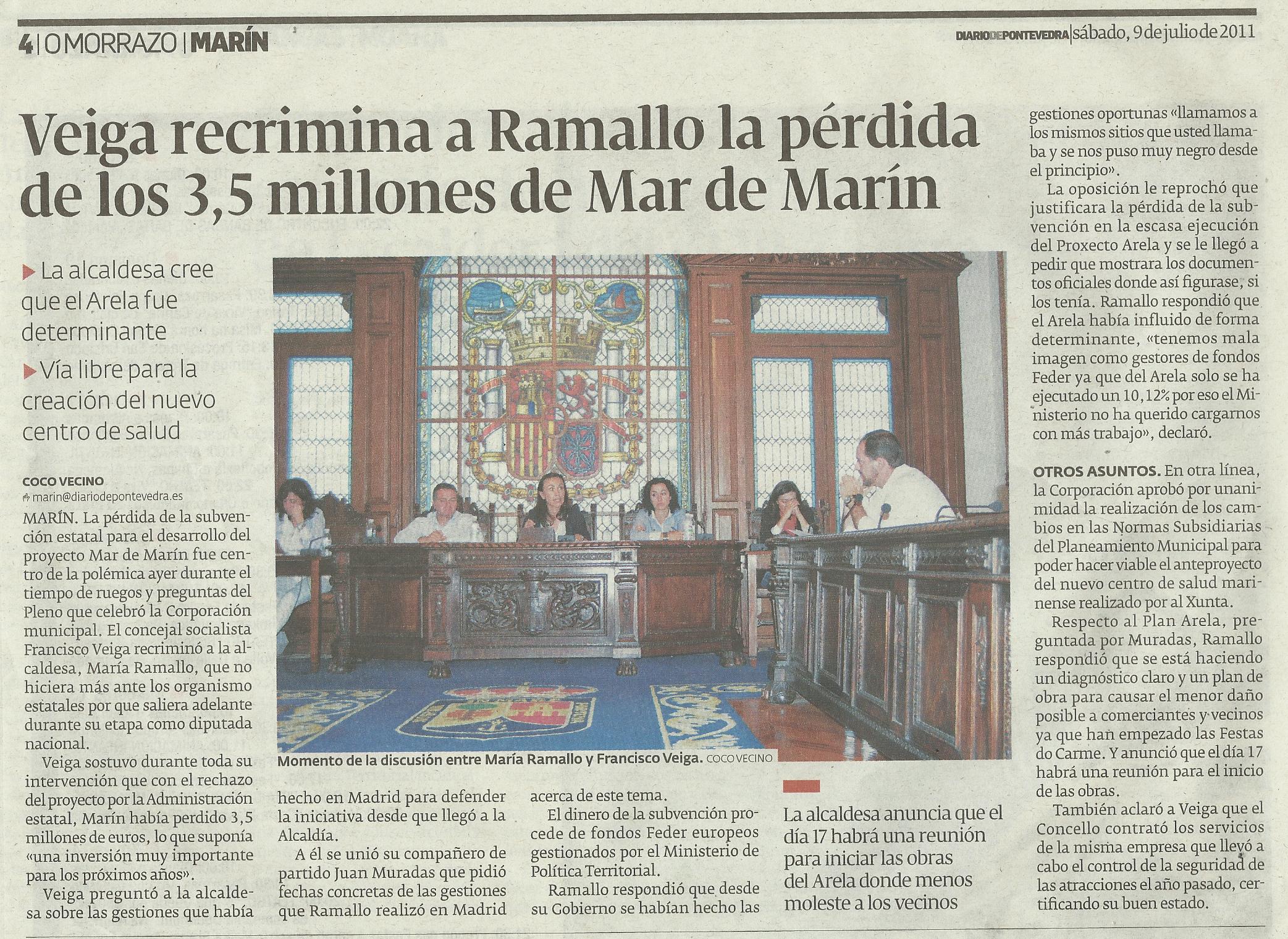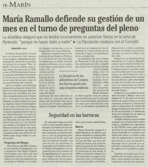 O Mar de Marín foi, novamente, motivo de interrogatorio: que por que non se convocara a xunta de portavoces, que se tiña constancia por escrito dos argumentos oficiais que levaron a rexeitar o proxecto, se lle foran pedidos ao Goberno Central as explicacións oportunas e a acta de valoración coas puntuacións… Máis papista que o mesmísimo papa. Seguiu terqueando encol do Arela, da festa en Portocelo, das alfombras do Corpus insinuando que ía aparecer unha factura da empresa por eses servizos… Re-preguntas de preguntas que xa foran contestadas, para desesperación do público que asistía ao pleno, e pacencia infinda de María Ramallo, á que non lle quedaba outra que aguantar o tipo ante semellante abuso. Máis madeira: sobre o envío de documentación do PXOM á Dirección Xeral de Patrimonio, sobre a incidencia do Plan de Ordenación do Litoral no PXOM, e sobre o cobro de taxas aos feirantes instalados nas festas do Carme. Un totum-revolutum-popurri sen outro afán que o de dar a nota, pretendendo actuar como os máis currantes do mundo mundial cando o que conseguiron PSOE e BNG foi todo o contrario: quedar coma os ladrillos-peñazos-tocanarices que son. Naturalmente, María Ramallo, contestoulle (alá máis ou menos á súa maneira) as “preguntas”.