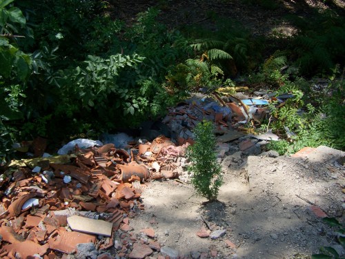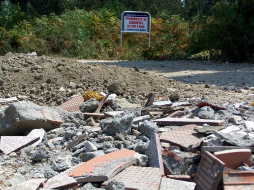 Nas imaxes que seguen pódese apreciar o estado dese mesmo vertedoiro a principios deste mes de xullo, como proba do recente que é este novo depósito de escombros. Por desgraza, o grave non é que antes aparentara ter menos lixo, pois o peor non está á vista, senón no que non se ve. Asomándonos ao borde do terraplén obsérvase como o groso acumúlase máis abaixo. É doado facerse unha idea do modus operandi dos infractores: suben pola pista conducindo un tractor ou furgoneta, chegan a ese lugar, recúan para atrás, abren a porta ou vasculan o remolque, e o material que transportan cae ao baleiro. Dan a volta e marchan, impunemente.
