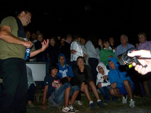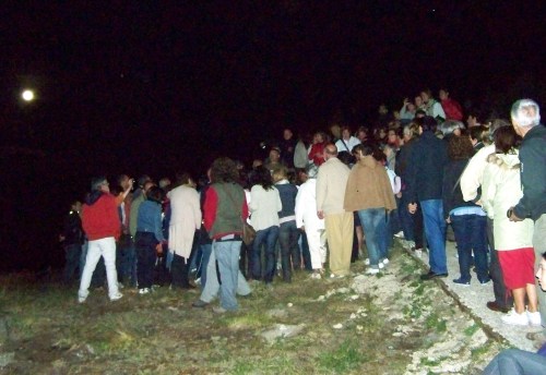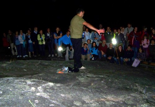 Despois da charla, a visita sobre o terreo á Área Arqueolóxica de Tourón, lanterna en ristre, para ver os círculos concéntricos con coviñas que se atopan no Outeiro da Forcadela; tamén os da Laxe das Cruces, onde destacan ademais os cervos feitos coa técnica do baleirado; para rematar finalmente na espectacular pedra situada no Nabal de Martiño, onde se atopan os petroglifos máis expresivos. Os asistentes non deixaron de sacar fotos, de preguntar curiosidades. Era espectacular contemplar dende o alto, en plena noite, o itinerario serpenteante que marcaban as luces dos visitantes, coma unha “Santa Compaña” máxica que subía monte arriba. E se tan asombroso era o espectáculo sobre o terreo, non menos marabilloso era no ceo, cunha lúa chea redonda e brillante que iluminaba a noite e as constelacións.
