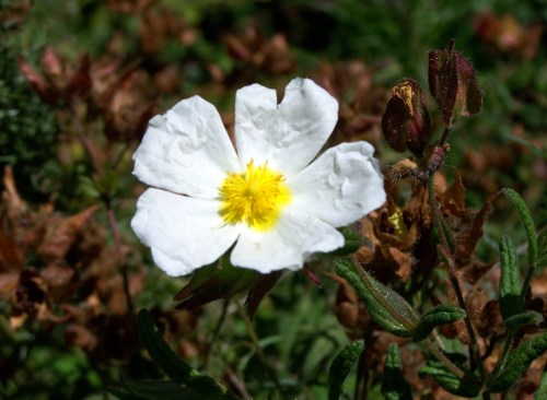 “Cistus psilosepalus sweet” ou carpaza: Arbusto con talos ramosos de ata 100 cm. As follas son sésiles, ovado-oblongas, a linear-oblongas, planas ou a penas revolutas, pelosas por cara e envés, percorridas por tres veas. As flores levan cinco sépalos, dous deles algo maiores de cor verde marela, e cinco pétalos brancos, a miúdo cunha mancha basal amarela. Estames iguais. Froito en cápsulas que abre por cinco valvas. Florece en maio-xuño en chans ácidos, senso máis abondoso en baixas latitudes. Constitúe ENDEMISMO da metade oeste da Península Ibérica.