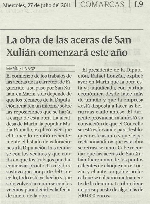 Os veciños e veciñas de San Xulián estamos algo máis preto de podernos felicitar porque o (case) eterno proxecto das beirarrúas vaise vislumbrando por fin. A Xan Montenegro alegraríalle moito ler esta noticia; mágoa que non as chegue a ver construidas, dándolle servizo a tantos habitantes da parroquia que a diario soben e baixan ata o centro de Marín polo borde da estrada. Trátase dunha actuación valorada en máis de 700.000 euros que, máis pronto que tarde (ogallá) farase realidade.