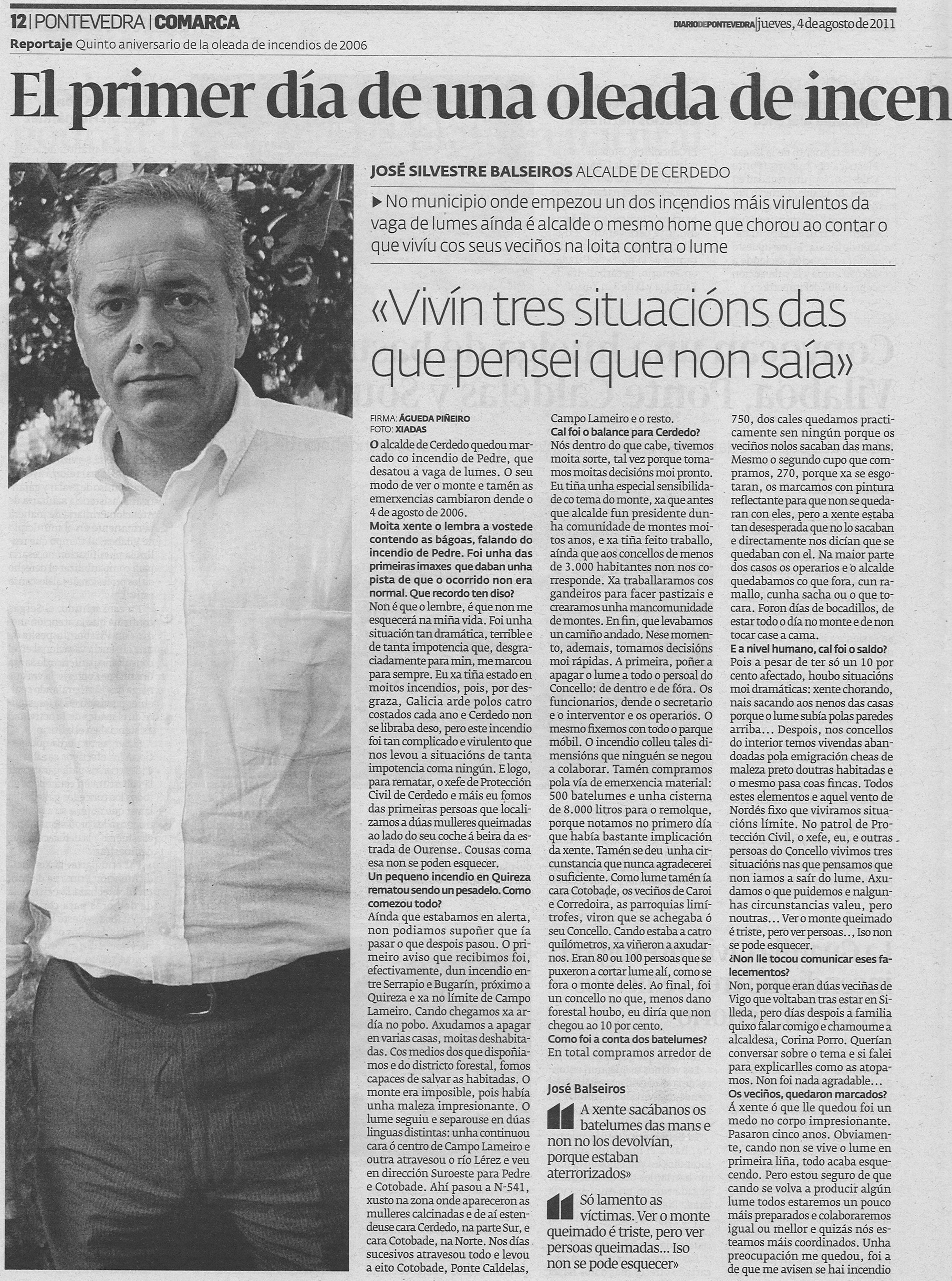Nunca esquecerei a voz quebrada do alcalde de Cerdedo, José Balseiros, explicando a traxedia acontecida en Pedre durante a terrible vaga de lumes de 2006. O seu rostro conxestionado e as bágoas asomando nas concas dos ollos eran a imaxe da consternación. Non lle desexo tan mal trago a ninguén.