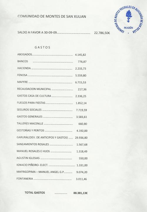 E a quen se lle pagaron 3.011,46 € por traballos de fontanería? Cales son as empresas ou razóns sociais que cobran 4.192 € en concepto de xestoría e peritaxe? A que lle chaman “gastos xerais” por valor de 3.583,61 €? Quen son os abogados que perciben da Comunidade de Montes de San Xulián a friolera de 4.145,82 €?