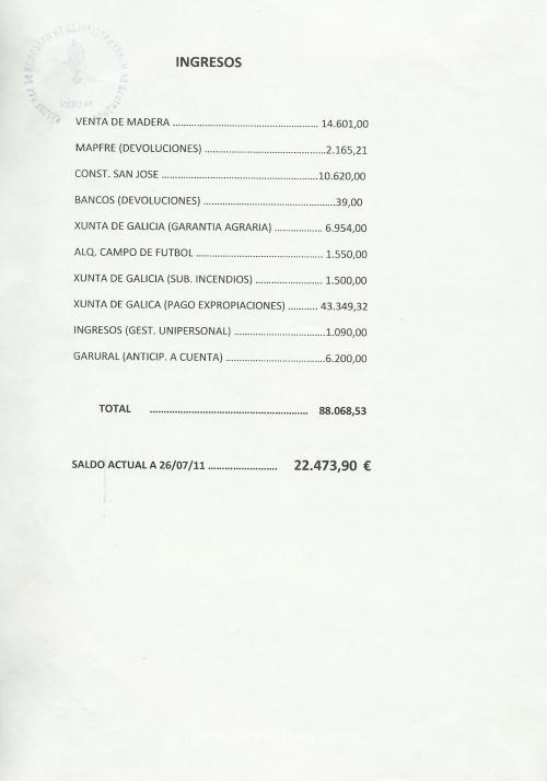 E o presidente adicouse a explicar someramente a que se destinaran os cartos da Comunidade. Comezou polo final, polo que lle interesaba, afirmando que o saldo actual a 26 de xullo de 2011 era de 22.473,90, co cal, a directiva “só gastara a maiores 312,6 €”. E total, explicouse mal, que nin unha simple resta sabe facer, posto que se o saldo en 2011 é de 22.473,90 e o saldo en 2009 era de 22.786,50 €, non só non gastaron máis, senón que “aforraron” 300 e pico euros. Un momento para estes “muchachos”, xa!