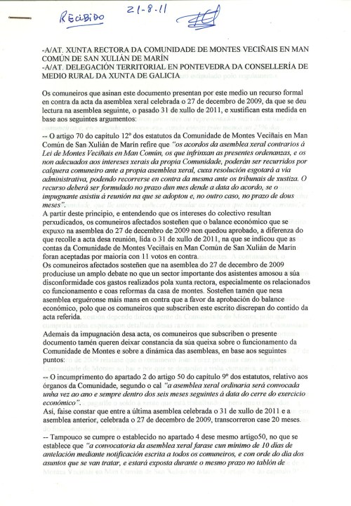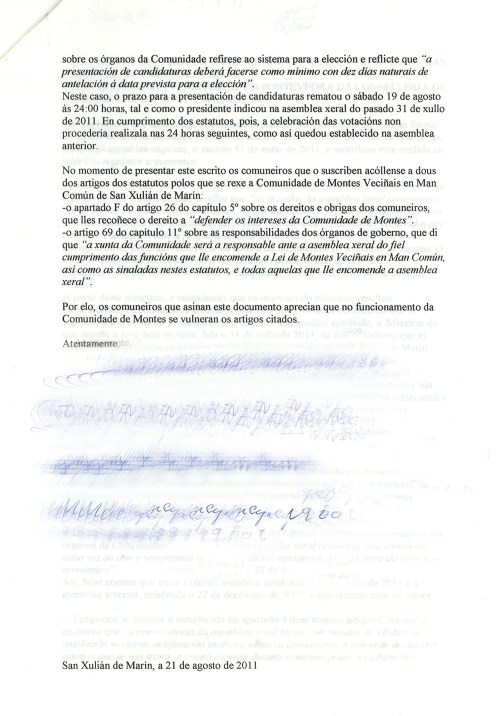 Tivo que ser despois de levantarse a sesión cando, despois de insistirlle ao presidente que se non recollía o escrito estaba vulnerando o artigo 70 dos estatutos da Comunidade de Montes (“…os acordos da asemblea xeral contrarios á Lei de Montes Veciñais en Man Común, os que infrinxan as presentes ordenanzas, e os non adecuados aos intereses xerais da propia Comunidade, poderán ser recurridos por calquera comuneiro ANTE A PROPIA ASEMBLEA XERAL…”) e, por tanto, tería que aterse ás consecuencias, fora desde o punto de vista administrativo ou legal. Entón si entrou polo aro: recolleu unha copia do escrito e fíxolle un garabato á outra, que nin selo oficial da Comunidade de Montes lle quixo poñer.