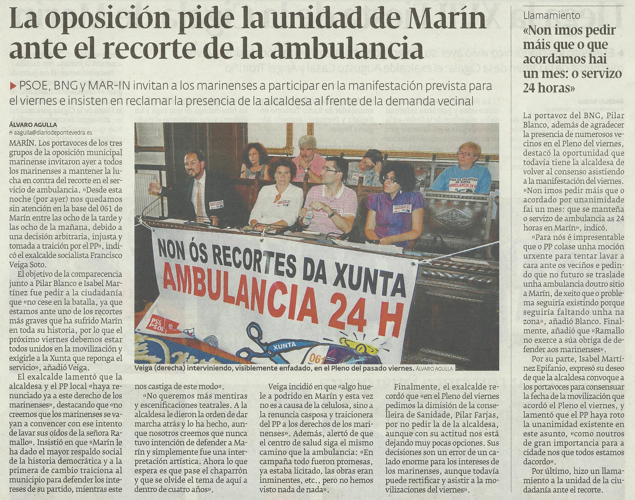 “É totalmente lexítima a loita para non perder o servizo de ambulancias en Marín. Sin duda foi un duro golpe para María Ramallo que a Xunta de Galicia lle faga isto a un pobo que lle dou a maioría absoluta ó PP. O que resulta patético e a forma que elixen algúns para amosar o seu descontento. No último pleno, Fran Veiga, en canto veu as cámaras dos periodistas, levantouse do seu escaño para poñerse detrás da pancarta que os da CIG tiñan á porta da sala. Xabier Aboy dáballe codazos para votalo de alí porque non quería que lle estropeara a foto, e o outro que non se apartaba nin con agua quente.