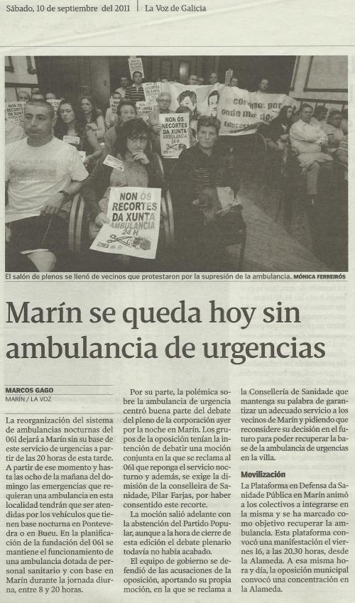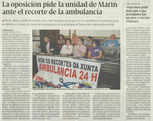 O peor é que Marín quedou sin servizo nocturno de ambulancias por culpa dos recortes que se están a dar en toda España: PP, PSOE ou calquera outro que goberne. Iso é inamovible por moito que protestemos e patexemos os marinenses, a alcaldesa ou Xabier Aboy”.
