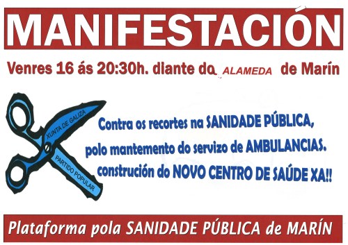 Este venres día 16 a partir das 20:30 horas partirá la Alameda de Marín unha manifestación “contra os recortes na sanidade pública, polo mantemento do servizo de ambulancias e a construcción do novo centro de saúde”. Convoca a protesta a recén constituida Plataforma pola Sanidade Pública de Marín, xurdida a raíz do rexeitamento motivado pola reducción do horario de atención da ambulancia asistencial con base en Marín, que dende o pasado día 10, entre as 8 da tarde e as 8 da mañá, tense que desprazar dende Bueu ou Pontevedra para cubrir unha emerxencia nesta vila.