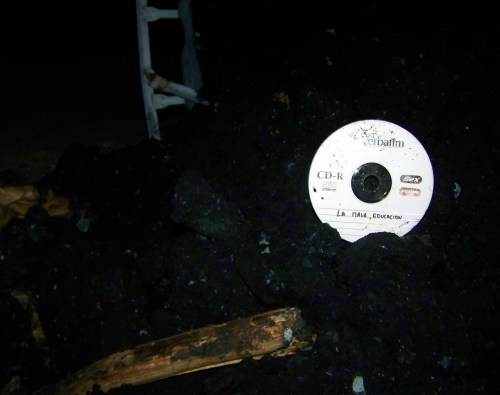 …O azar é ben caprichoso. Subindo ao monte para comprobar, efectivamente, como xa sospeitabamos, que ninguén movera nin un só dedo para poñerlle remedio a esta lamentable incidencia, atopamos, a poucos metros do bidón, nunha zona que fora desbrozada, un CD dado a volta. Collémolo do chan, virámolo para saber cal era o seu contido e, escrito en letras maiúsculas, lemos tres palabras: “A MALA EDUCACIÓN”.