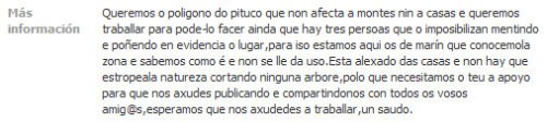 Queremos o poligono (falta o til no “i”) do pituco (a letra P sería maiúscula) que non afecta a montes nin a casas e queremos traballar para pode-lo facer ainda (falta o til no “i”) que hay (escríbese con “i” latino) tres persoas que o imposibilizan (dise “imposibilitan”) mentindo e poñendo en evidencia o lugar, para iso estamos aqui (falta o til no “i”) os de marín (o M ten que ir en maiúscula) que conocemola (falta o til no “e” e dise “coñecémo-la” ou “coñecemos a”) zona e sabemos como é e non se lle da (falta o til no “a”) uso. Esta alexado (dise “alonxado”) das casas e non hay (escríbese con “i” latino) que estropeala (escríbese “estropear a” ou con segunda forma do artigo “estropea-la”) natureza cortando ninguna arbore (falta o til no “a”), polo que necesitamos o teu a apoyo (dise “apoio”) para que nos axudes publicando e compartindonos (dise “compartindo”) con todos os vosos amig@s, esperamos que nos axudedes a traballar.
