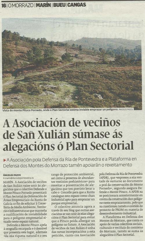 Como xa se anunciou nesta páxina, e así o vén de recoller o Diario de Pontevedra na súa edición de hoxe, a Asociación de Veciños de San Xulián, a Asociación pola Defensa da Ría e a Plataforma en Defensa dos Montes do Morrazo van presentar alegacións para que o Goberno autonómico manteña ese criterio e ignore o recurso do Concello de Marín, que segue reclamando a instalación un parque empresarial no Pornedo.