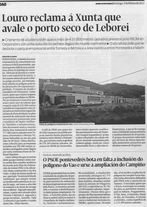 Diario de Pontevedra: “O edil do PSOE non quere nin oír falar tampouco da posible posta en marcha dunha plataforma loxística entre Marín e Pontevedra, que contaría cunha superficie de 279.264 metros cadrados. No avance do PXOM de Pontevedra, estes terreos aparecen cualificados parcialmente como de “Protección Integal Arqueolóxica”, se ben o plan urbanístico da cidade vén de ser novamente rexeitado polo Goberno galego. Aínda así, Louro desaconsella levar a cabo esta infraestrutura, á que se lle outorga unha viabilidade socioeconómica e medioambiental de 29 puntos. O propio documento redactado por técnicos da Xunta desaconsella desenvolver actuacións que obteñan menos de 30 puntos”.