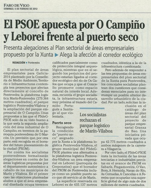 Faro de Vigo: “Los socialistas pontevedreses formalizarán alegaciones en contra de las áreas logísticas propuestas por el departamento autonómico a caballo de los municipios de Marín y Vilaboa. En el primer caso, las objeciones planteadas aluden a que el área empresarial diseñada ocupa terrenos calificados parcialmente como de protección integral arqueológica”.