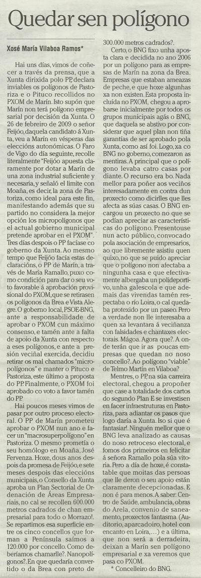 O artigo de Vilaboa non aporta nada, é pura redundancia, empezando polo titular, que está exprimido e requetexprimido. O artigo de Vilaboa é unha mentira espichada nun pau: o concelleiro nacionalista ten a incomensurable desfachatez de dicir que “Marín non terá polígono empresarial por decisión da Xunta” cando a decisión de que no Plan Sectorial se plasme a inviabilidade económica e ambiental do polígono proxectado no Monte Pituco non é algo “subxectivo” como un motivo político, senón que esa decisión baséase en datos técnicos e obxectivos: a forte pendente do terreo, a presenza de elementos arqueolóxicos catalogados, a existencia de recursos hidrolóxicos… mesmo unha servidume de paso aeronáutica! por non falar da catalogación como espazo natural protexido, e da alta intervisibilidade que o Informe de Sostibilidade Ambiental do propio PXOM de Marín lle confire a este espazo.