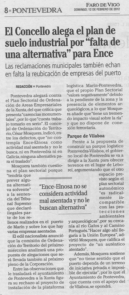 “Entre las observaciones que le trasladará el ayuntamiento de Pontevedra a la Xunta figura su rechazo al proyecto de instalación de la plataforma logística Marín-Pontevedra, que el propio Plan Sectorial “valora negativamente” debido a la pendiente de la zona y la presencia de elementos arqueológicos, a lo que Mosquera añade que “tiene un tremendo impacto visual sobre la ría” y que no dispone de conexión ferroviaria“.