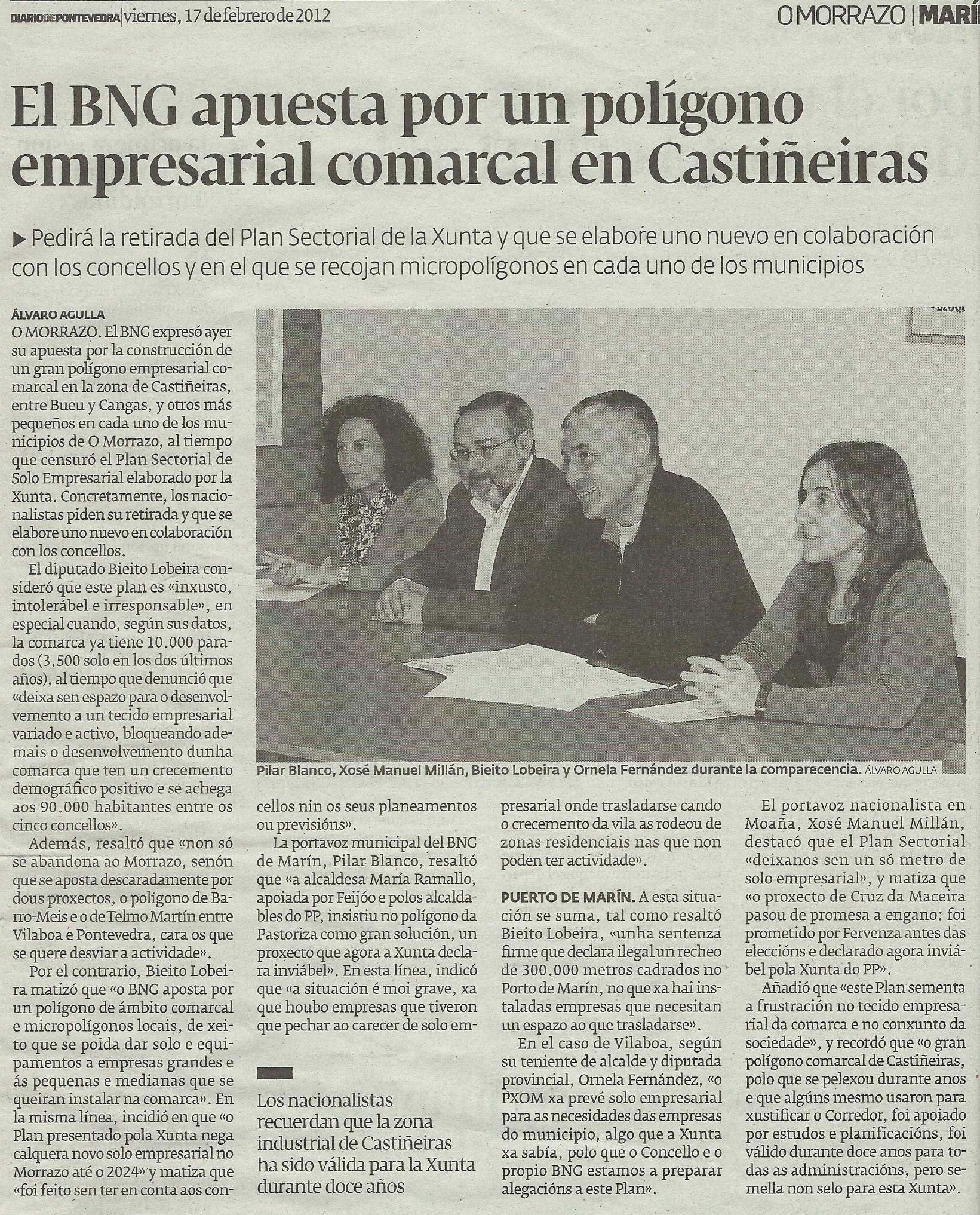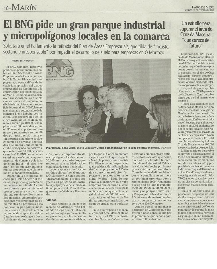 “Non saben o que queren, agora todos queremos un polígono ao lado da casa, aínda que non haxa un can para facer empresas, así lle vai ao de Meis. E despois outros aspectos que se poderían explotar sen afectar o entorno, déixanos de lado. Nótase ben que o BNG de Marín, ten as ideas “claras”, así lle vai nas urnas, e así lle seguirá indo. O BNG da comarca do Morrazo tiña que recapacitar, xa que nuns lados di unha cousa, está a favor da Plataforma Montes do Morrazo, e despois noutros lados está en contra do Monte de Pornedo, onde apoiaba facer un micropolígono deses, un espazo rico en recursos Naturais e Arqueolóxicos, Monte Pituco, Espazo Natural e Arqueolóxico dos Sete Camiños, que se podería explotar como fan noutros sitos, coma en Asturias, Cantabria e Pais Vasco. E despois eles din que son os que defenden a nosa cultura, as nosas tradicións e o noso pobo. Polo que se está vendo, non saben nin o que queren nin o que defenden, debe ser segundo lles dea o aire. En Castellón fan aeroportos para pasear os veciños, e aquí algúns políticos, e algúns comuneiros que vén unha oportunidade para levar cartos coas expropiacións, queren facer polígonos sen naves para que os veciños poidan pasear, que o de facer aeroportos xa esta moi visto”.