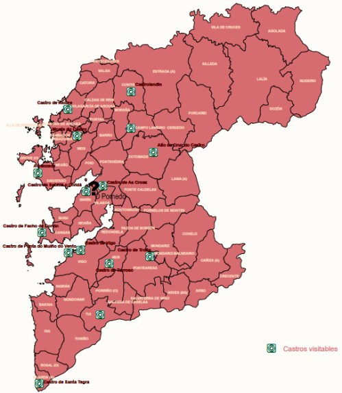 (MAPA DE CASTROS VISITABLES NA PROVINCIA DE PONTEVEDRA – FONTE: DEPUTACIÓN DE PONTEVEDRA).