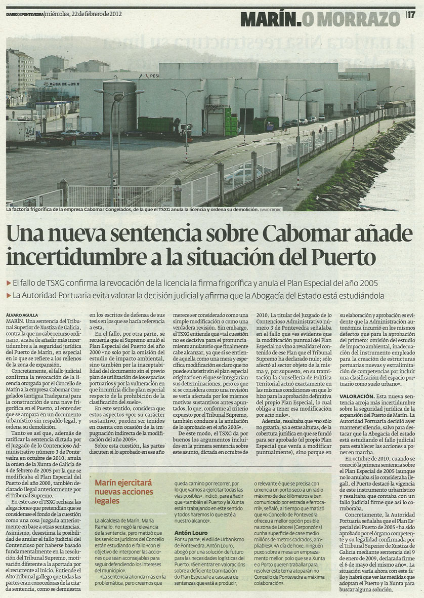 Medio en broma, medio en serio, a Plataforma en Defensa da Praza dos Praceres augura que ao Concello de Marín acabaranlle embargando un pedazo da Finca de Briz, unha parte ben xeitosa da Alameda ou mesmo un anaco do propio edificio da Casa Consistorial para pagarlle a este colectivo polas indemnizacións que lle corresponden a raíz das sucesivas sentenzas nas que se ratifica a precaria situación urbanística de varias empresas situadas no recinto portuario, a raíz do fallo inapelable do Tribunal Supremo en outubro de 2009 que anula o Plan Especial do Porto. A última confirmación de que a Plataforma de Placeres levaba razón aféctalle á nave de Conxelados Cabomar, antiga Tradepana, da que o Tribunal Superior de Xustiza de Galicia ordena a súa demolición.