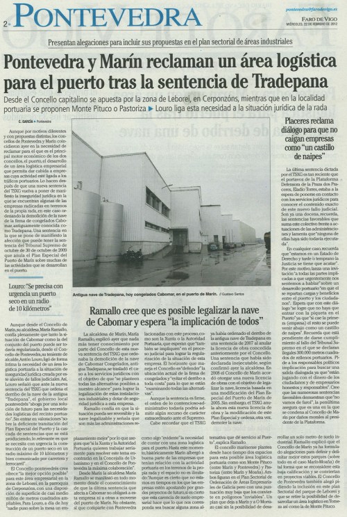 Faro de Vigo: “Pontevedra y Marín reclaman un área logística para el puerto tras la sentencia de Tradepana“