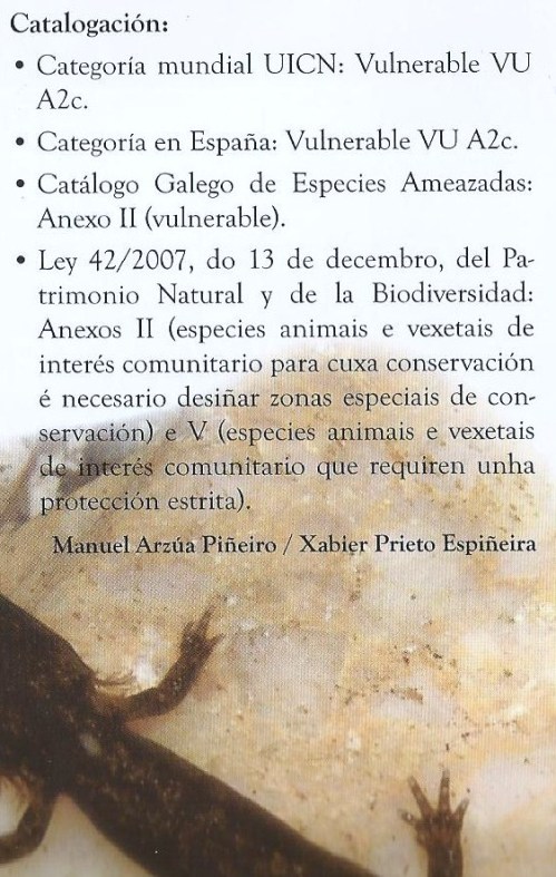 Entre as súas páxinas atópase esta exhaustiva análise sobre o hábitat e a distribución -tanto a nivel mundial como en Galicia- deste anfibio endémico e protexido, do que DEFENDE O MONTE PITUCO vén de alertar sobre a súa presenza no ámbito do Monte Pornedo. No apartado adicado á súa catalogación, detállanse neste Atlas cuestións que denotan a fraxilidade da súa supervivencia, polo que mesmo se lle aplicou unha lei que obriga á súa PROTECCIÓN ESTRICTA.