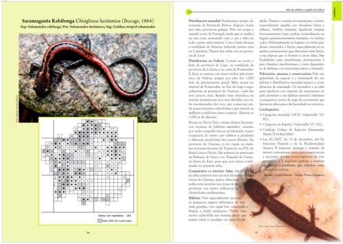 Manuel Arzúa Piñeiro e Xabier Prieto Espiñeira asinan un interesante artigo sobre a “Chioglossa lusitanica”, ou saramaganta rabilonga, no Atlas dos Anfibios e Réptiles de Galicia, elaborado e editado -presentouse aínda o pasado mes de setembro de 2011- pola Sociedade Galega de Historia Natural baixo a coordinación de Moisés Asensi Cabirta. Esta publicación, elaborada “sen ningún tipo de subvención nin axuda pública ou privada, tanto no labor de campo como na súa edición”, segundo explican dende a propia SGHN, foi posible “grazas ao esforzo humano e económico de todos os colaboradores na obtención de datos no campo, e á aportación económica da Sociedade Galega de Historia Natural”.