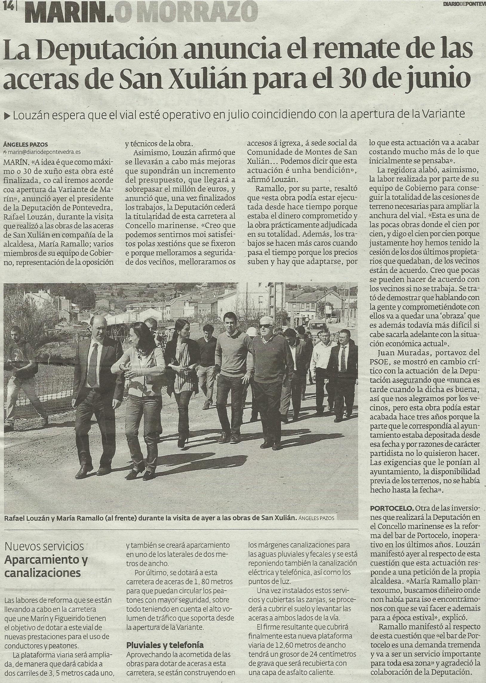 O presidente da Deputación de Pontevedra, Rafael Louzán, e a alcaldesa de Marín, María Ramallo, visitaron as obras das beirarrúas de San Xulián que, segundo calculan, poderían rematar a finais do mes de xuño; a mesma data que se prevé para que finalice tamén a construcción da variante de Marín. O Concello vai acabar sendo o titular da estrada que, dende Marín ata Figueirido, atravesa a parroquia, unha vez que o organismo provincial lle transfira a súa xestión. Atrás quedaron xa as longas e inútiles liortas entre a Administración local e a provincial durante a anterior lexislatura. Á veciñanza, en realidade, tanto lle ten que partido colga a “medalla”; o importante é dispoñer, o antes posible, dun vial digno e seguro para o tránsito dos peóns e a circulación dos vehículos. Finalmente os dous propietarios que se resistían a ceder os terreos necesarios para a execución dos traballos acabaron tamén por aceptar as condicións; posto que do que se trata é de favorecer un ben colectivo.
