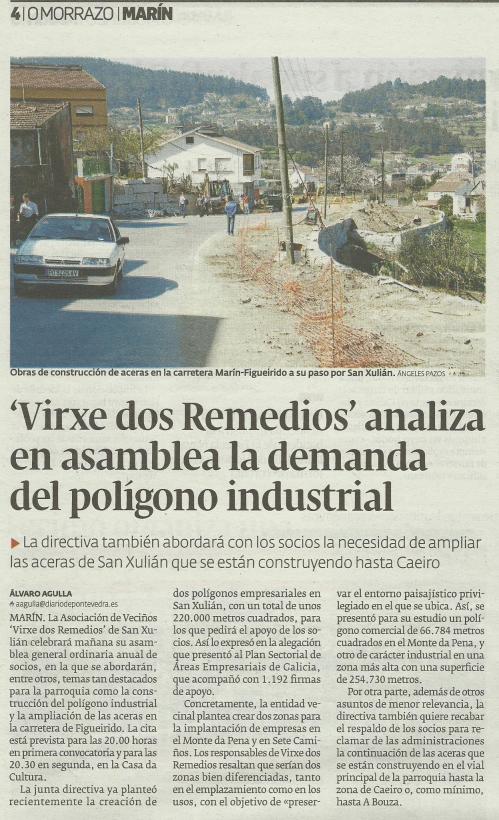 Tamén resulta sorprendente que na directiva da Asociación Virxe dos Remedios haxa veciños que asinaron EN CONTRA da instalación dun polígono industrial no Monte Pornedo, unha iniciativa que defende contra vento e marea esta entidade, aínda que sen o mínimo rigor informativo. Unha circunstancia tan chamativa pódese interpretar de tres maneiras: a) que haxa directivos que lle fagan honra ao alcume dos Remendos polo seu nulo sentido da ética e da coherencia persoal; b) que a directiva da Asociación Virxe dos Remedios padeza unha fonda división interna; c) que as dúas posibilidades anteriores se dean simultaneamente.