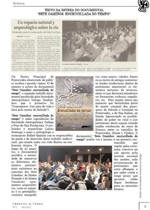 O novo boletín da Sociedade Antropolóxica Galega SAGA dá conta no seu segundo número deste mes de abril, do éxito de público na presentación do documental “Sete Camiños: Encrucillada do tempo”.