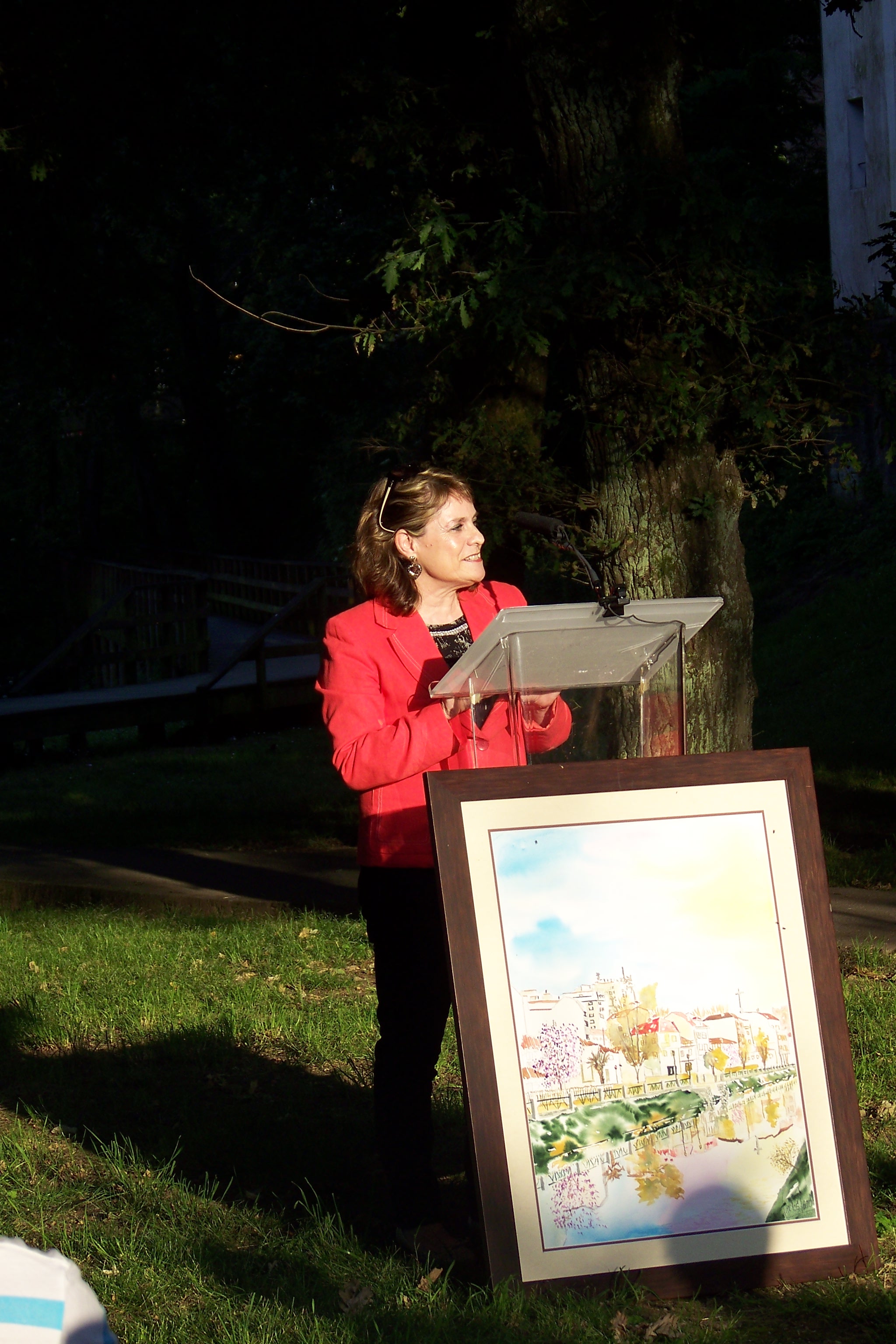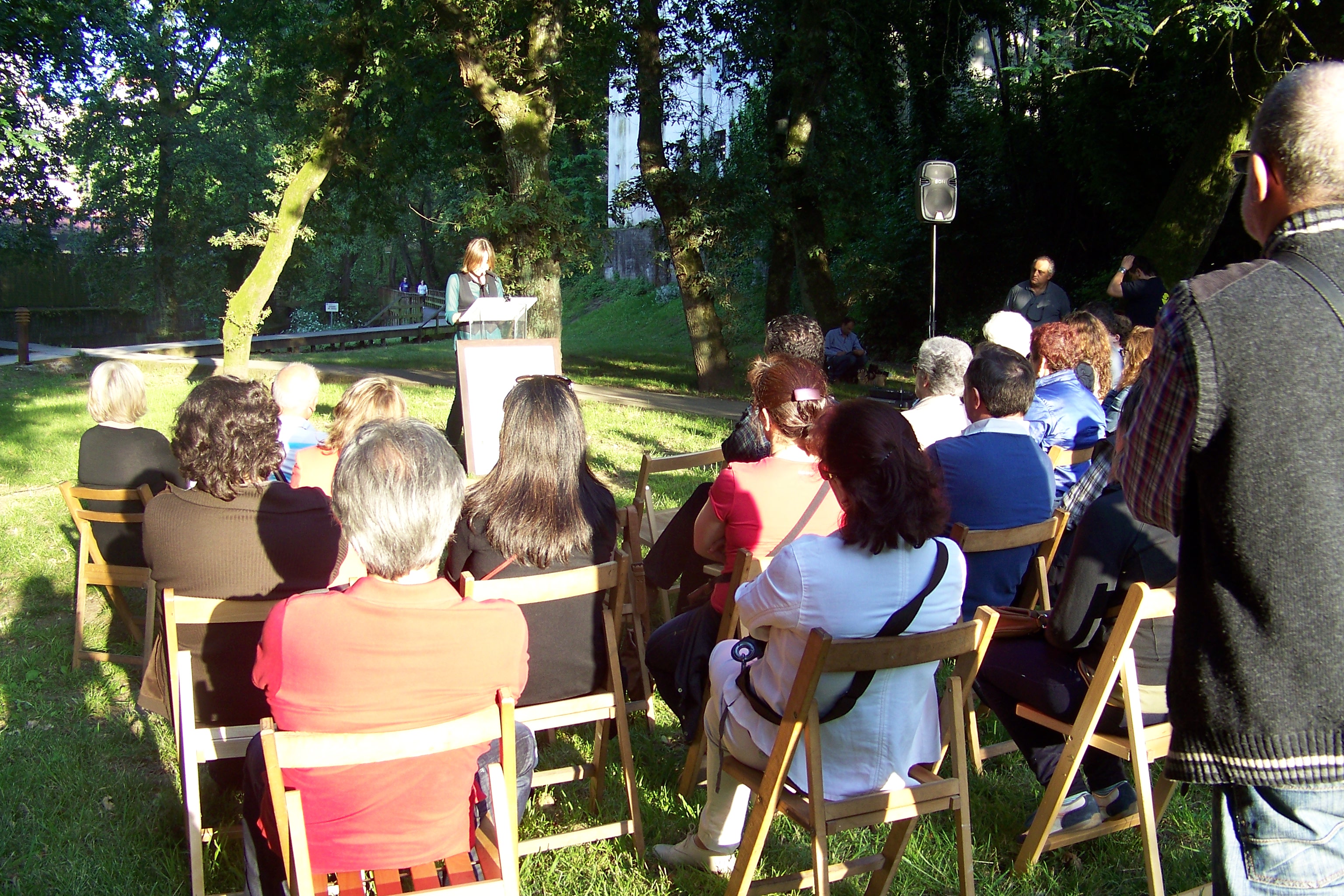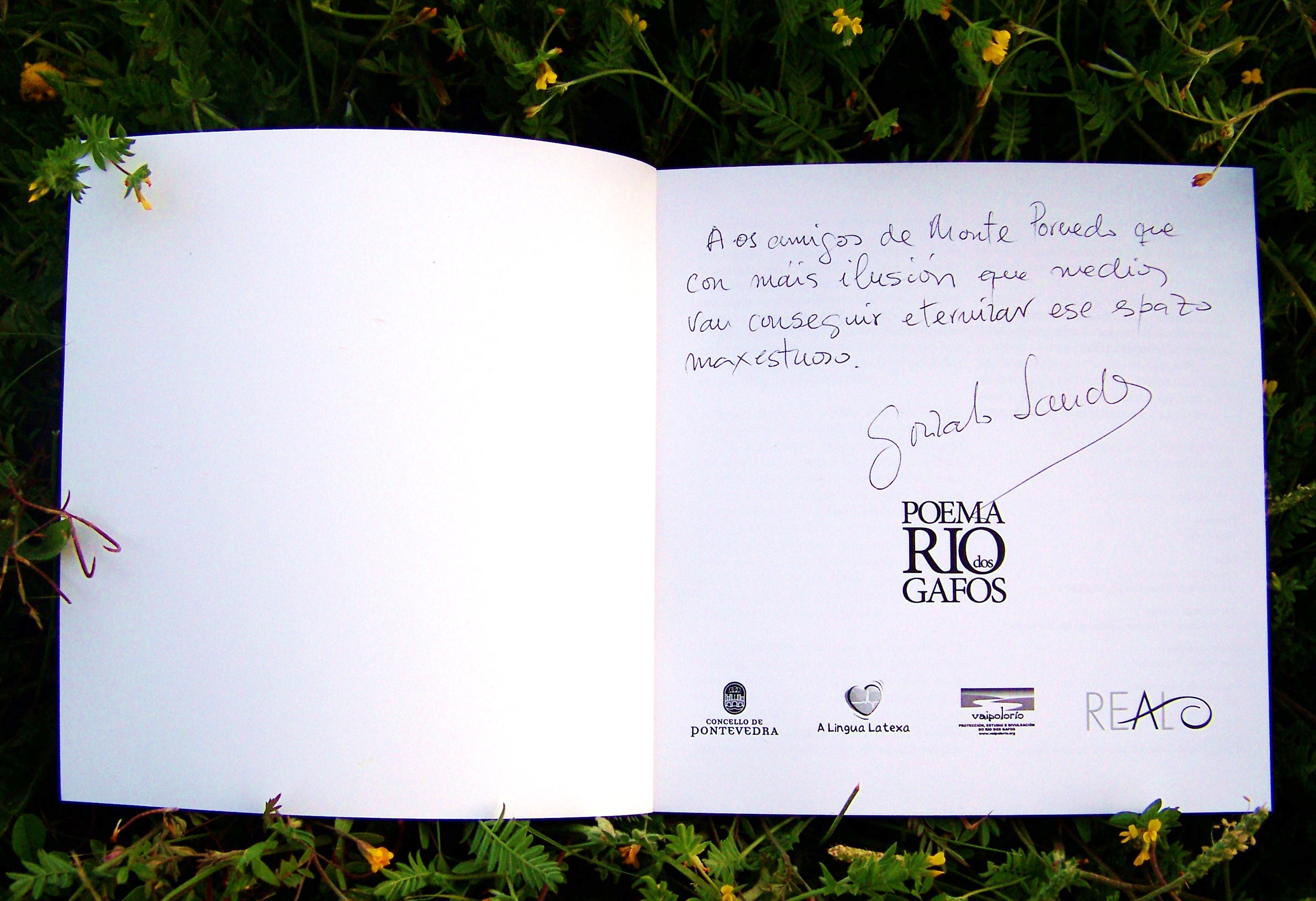 “Esta marabilla natural / que abrangue o río dos Gafos / non foi inaugurada por ninguén, / non houbo primeira pedra, / non ten placa conmemorativa. / Pregamentos telúricos, / sedimentos e clima / foron conformando a súa paisaxe maxestuosa: verde, pallosa, castaña, ocre, dourada; / reflectida no seu río de andar preguizoso / e augas cristalinas. / Así se mantivo / dende os seus antigos devanceiros. / Nin romanos nin franceses a turbaron, / mesmo os caciques recuaron / empacados como metoucos de millo pantasmais. / Non a estraguemos agora / que é un pazo de cultura, / un deleite para os ollos / e unha escola para os nosos fillos“.