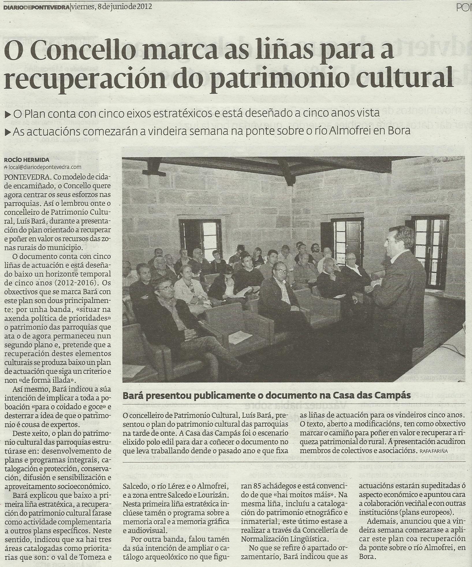 Bará indicou a súa intención de implicar a toda a poboación “para o coidado e goce” e desterrar a idea de que o patrimonio é cousa de expertos. Deste xeito, plan de patrimonio cultural das parroquias estrutúrase en: desenvolvemento de plans e programas integrais, catalogación e protección, difusión e sensibilización, e aproveitamento socioeconómico. Falou tamén de ampliar o catálogo arqueolóxico no que figuran 85 achádegos, e está convencido de que “hai moitos máis”.