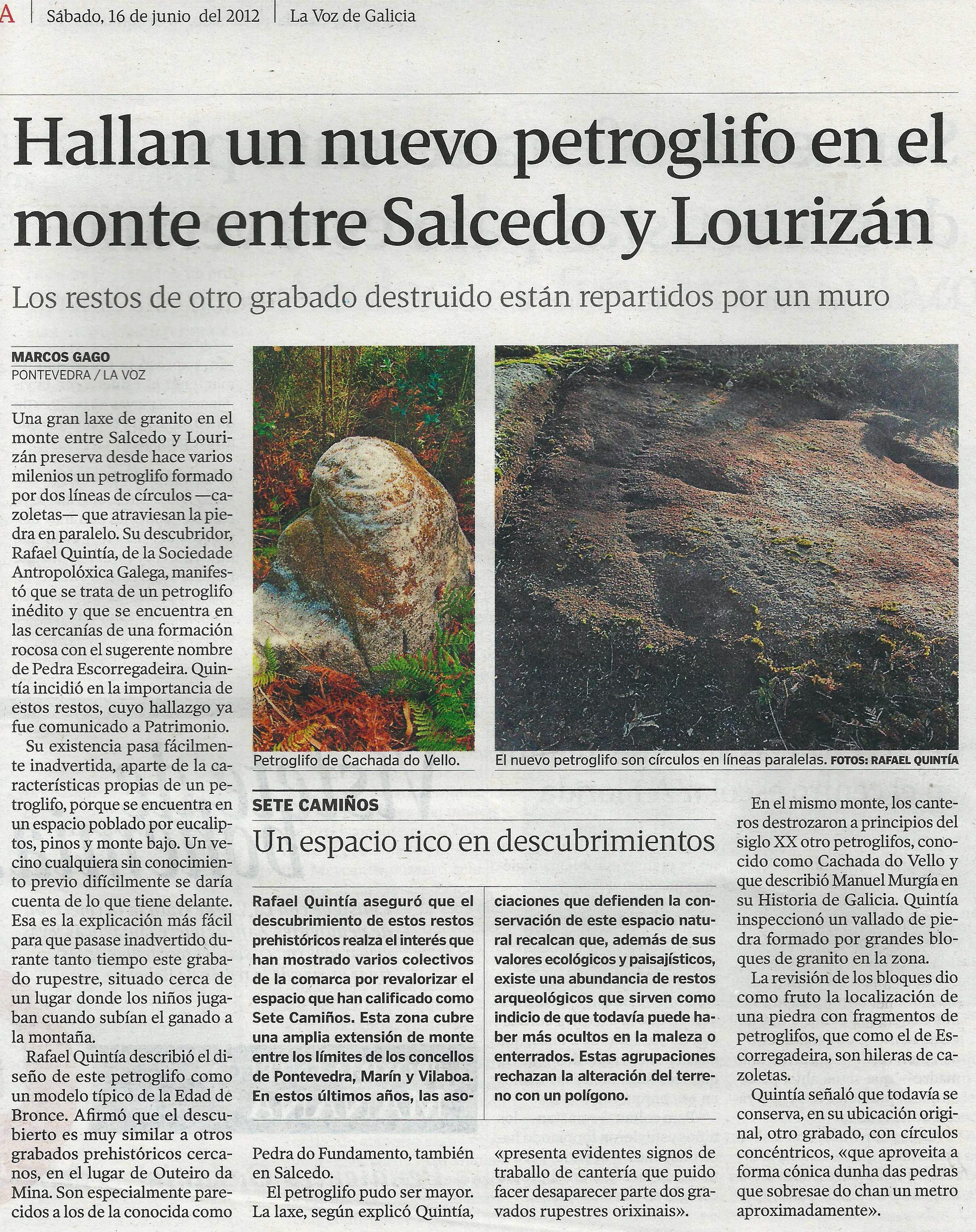 Una gran laxe de granito en el monte entre Salcedo y Lourizán preserva desde hace varios milenios un petroglifo formado por dos líneas de círculos -cazoletas- que atraviesan la piedra en paralelo. Su descubridor, Rafael Quintía, de la Sociedade Antropolóxica Galega, manifestó que se trata de un petroglifo inédito y que se encuentra en las cercanías de una formación rocosa con el sugerente nombre de Pedra Escorregadoira. Quintía incidió en la importancia de estos restos, cuyo hallazgo ya fue comunicado a Patrimonio.