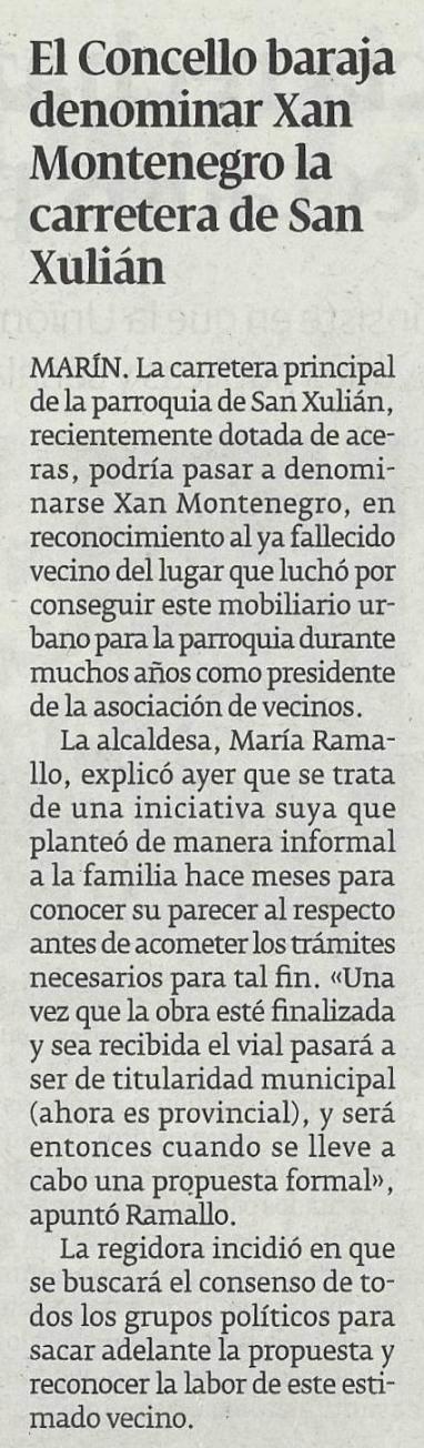 Non podía haber mellor día para “ceibar” unha nova coma esta (supoñendo que estea contrastada): que o Concello baralla poñerlle o nome de Xan Montenegro á estrada de San Xulián cando rematen as obras de humanización que se están realizando e a Deputación Provincial lle transfira a súa titularidade ao Concello para que sexa un vial municipal. Pois OGALLÁ!
