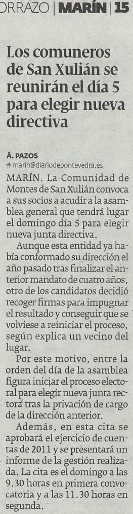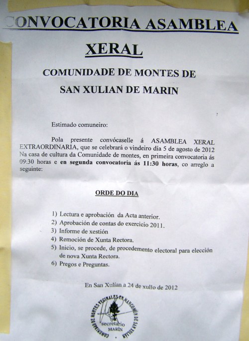 Este DOMINGO 5 de agosto celebrarase unha ASEMBLEA XERAL EXTRAORDINARIA da Comunidade de Montes de San Xulián, na Casa da Cultura. A primeira convocatoria é ás 09:30 horas da mañá, e a segunda, ás 11:30 horas. Chama a atención que a directiva escollera este horario tan atípico. Anteriores asembleas celebrábanse pola tarde, a partir das 17:00 ou 17:30h. Un horario asequible para practicamente todo o mundo. En cambio, esa decisión de trasladar unha asemblea xeral -que ademais ten carácter extraordinario, por tanto é importante- á franxa matinal, cabe interpretala con “mala baba”.