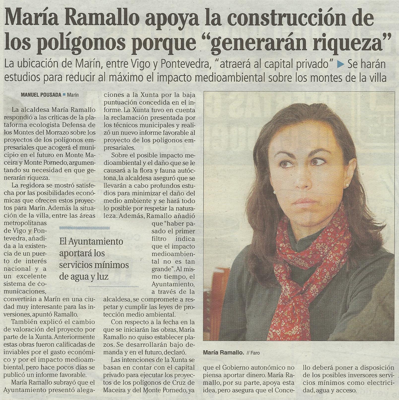 A rexedora municipal de Marín, María Ramallo, quitou a careta da ambigüidade que tiña posta dende mesmo antes de acceder á alcaldía, ao posicionarse claramente a favor da instalción dun polígono industrial no Monte Pornedo, agora que xa é practicamente oficial a través dese delirante PXOM que non quixo ter en conta a lexítima protección ambiental que posúe este espazo e as difíciles condicións da súa orografía natural para urbanizalo, sen esquecer a abundancia de restos arqueolóxicos catalogados e a privilexiada localización deste enclave sobre a ría, causando un impacto paisaxístico descomunal e irreversible.