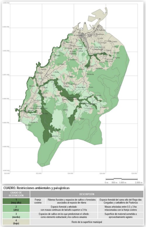 Semella que as alegacións presentadas polo Concello fan unha interpretación un tanto arbitraria dos mapas e das cores, pintando e despintando onde convén. Así, plantexan que no Monte Pornedo as RESTRICCIÓNS AMBIENTAIS son de tipo “baixo” e “alto”, como se a zona da Pena, do Caeiro e da Bouza afectadas no ámbito do polígono tiveran as mesmas cualidades que o centro urbán, cando se trata de “espazos de cultivo nos que predominan o viñedo como elemento estrutural e os cultivos anuais”, así como “superficie de matorial sometida a tratamento agrario”; unha descrición á que lle corresponde un tipo de aptitude “MEDIA”, mentres que ao monte propiamente dito, correspóndelle, en efecto, un grao de restricción ambiental “ALTO” por tratarse de “espazo forestal e arborado”.