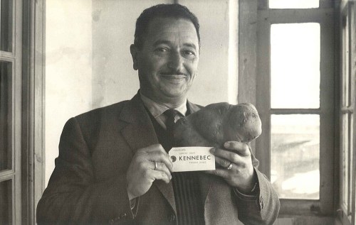 Avelino Pousa Antelo cunha das variedades de patacas, de meirande tamaño, das que promoveu a súa introdución en Galicia (Foto publicada en Praza Pública).