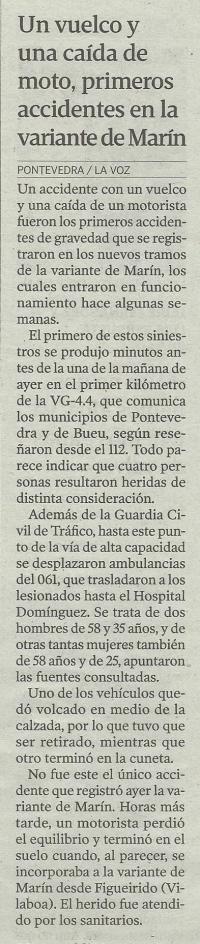 A prensa local informa dos primeiros accidentes que se produciron na Variante de Marín. A estes sucesos cómpre engadir unha incidencia máis que aconteceu o pasado 17 de agosto. Un condutor informou da existencia, pola mañá, dun animal de tamaño mediano atropelado no carril de Pontevedra a Marín, á altura de Lourizán. Nese momento, unha patrulla da Garda Civil dirixíase en dirección a ese punto coas luces de emerxencia prendidas.