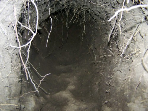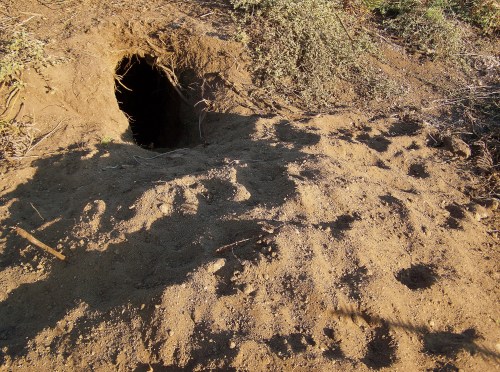 O pasado mes de agosto descubriamos varios buratos excavados no camiño, de pouca profundidade, con algunhas plumas e pegadas de animais ao redor. Algúns expertos atribúen a súa autoría a raposos en fase próxima a abandonar a raposeira. Nesta ocasión, ante unha das excavacións de maior profundidade, preguntabámonos que podería haber no interior, escuro e inaccesible a simple vista. Introducimos a cámara, prememos no disparador, e actívase o flash…