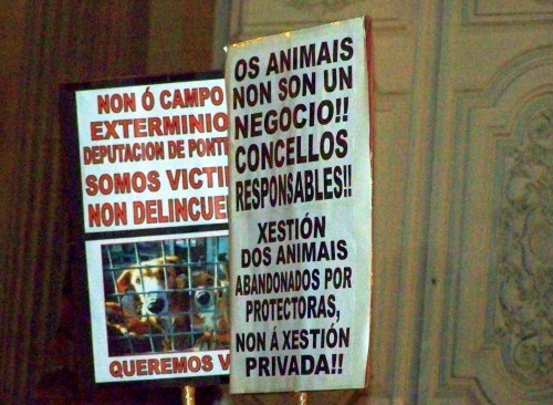 Na concentración organizada por protectoras de animais da provincia en contra da decisión da Deputación de Pontevedra de privatizar a xestión da canceira de Armenteira.