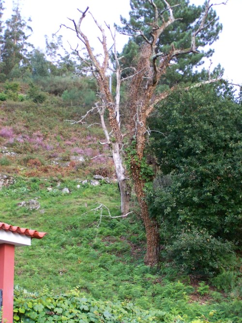 E por se fora pouco, moi preto deses tres pinos secos hai DOUS carballos secos que, polas súas dimensións tamén poden caer e causar estragos nunha propiedade colindante. Sen esquecer que, algo máis abaixo, no límite entre a Bouza e o Caeiro, hai UN carballo seco máis que está a carón da estrada e dunha vivenda, que tamén correrían perigo en caso de que se derrumbe.