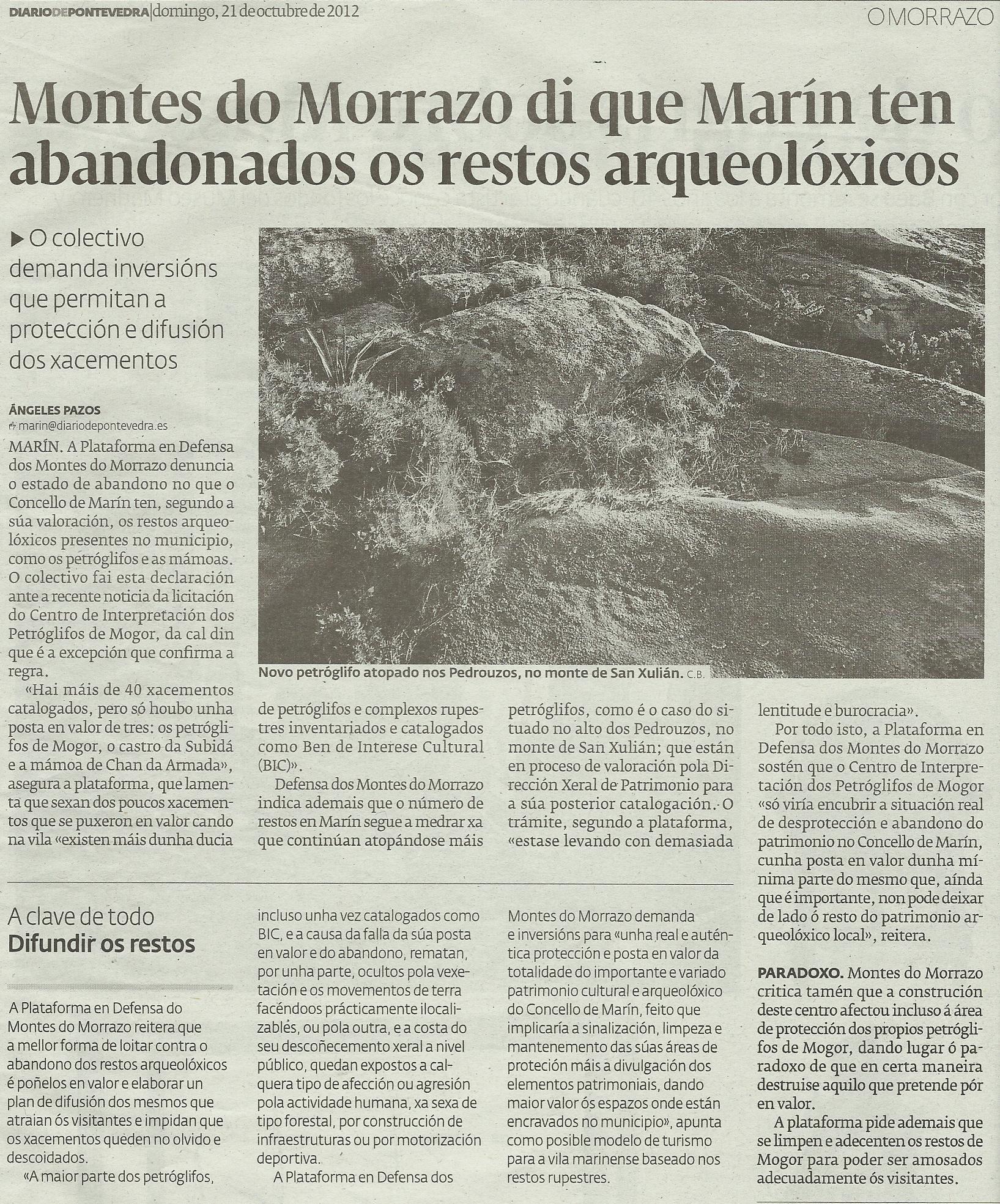 F.M. – MARÍN La Plataforma en Defensa dos Montes do Morrazo afirma que la mayor parte del patrimonio arqueológico de Marín está “abandonado y desprotegido”. El colectivo realiza esta denuncia tras la aprobación por parte del gobierno municipal de una licencia urbanística para la apertura del Centro de Interpretación de los Petroglifos de Mogor.