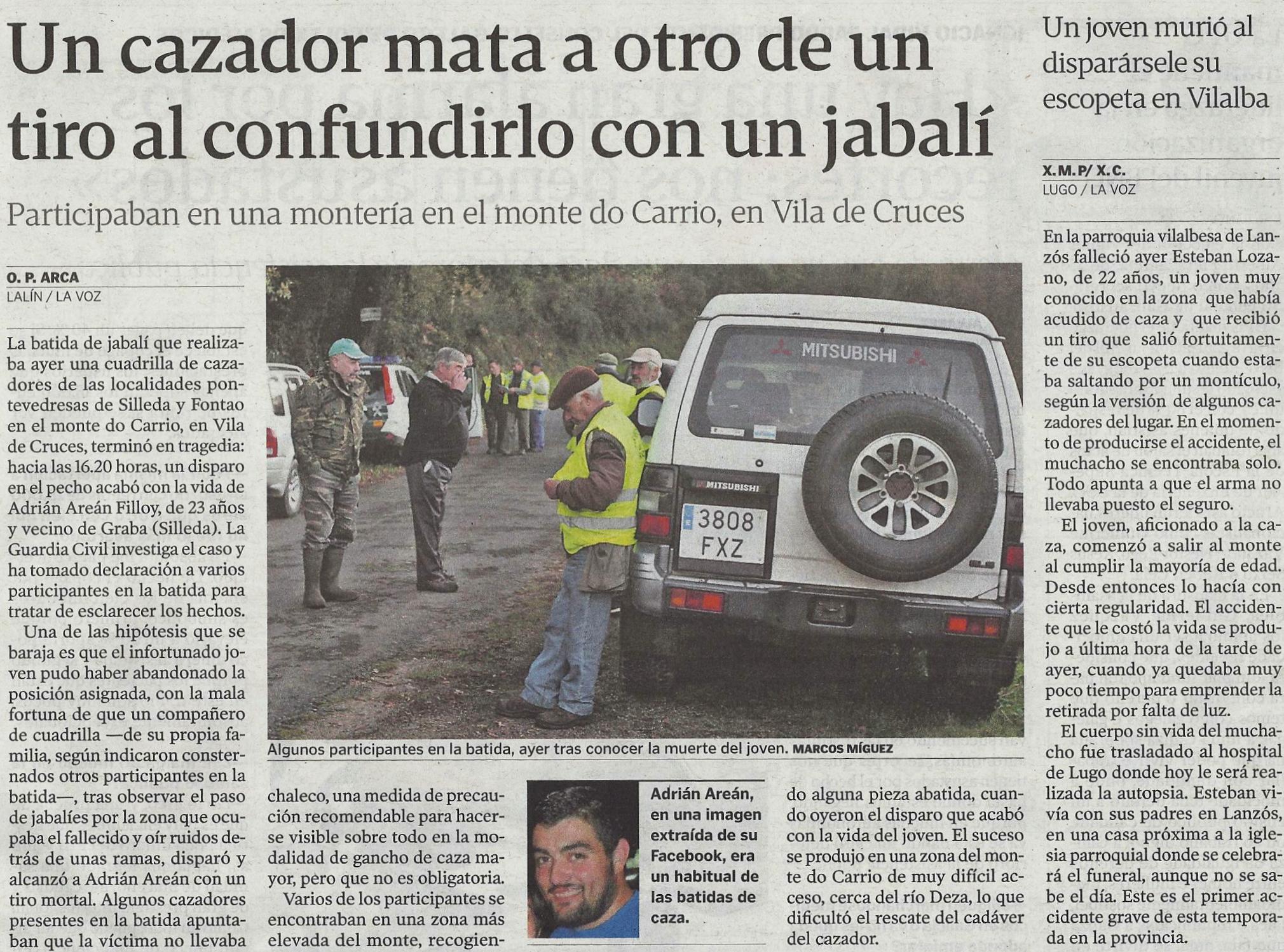 “Un cazador mata a otro de un tiro al confundirlo con un jabalí“, La Voz de Galicia.