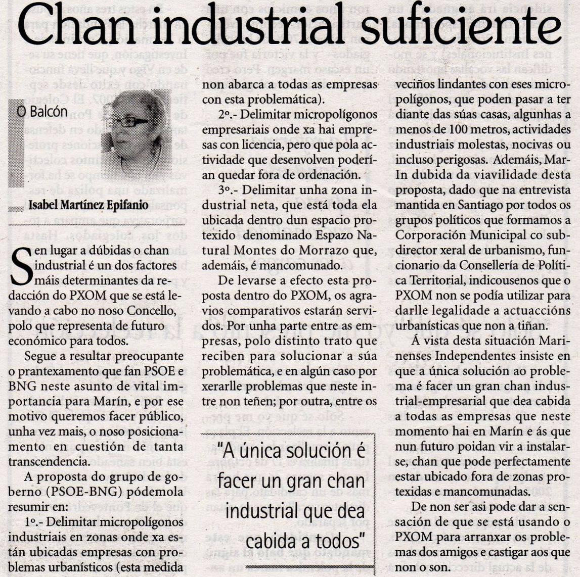 En canto a Isabel Martínez, de Marinenses Independentes, sobre a cuestión das infraestruturas, mantén a postura inicial do seu grupo político, que rexeita a instalación dun futuro polígono no Monte Pituco.