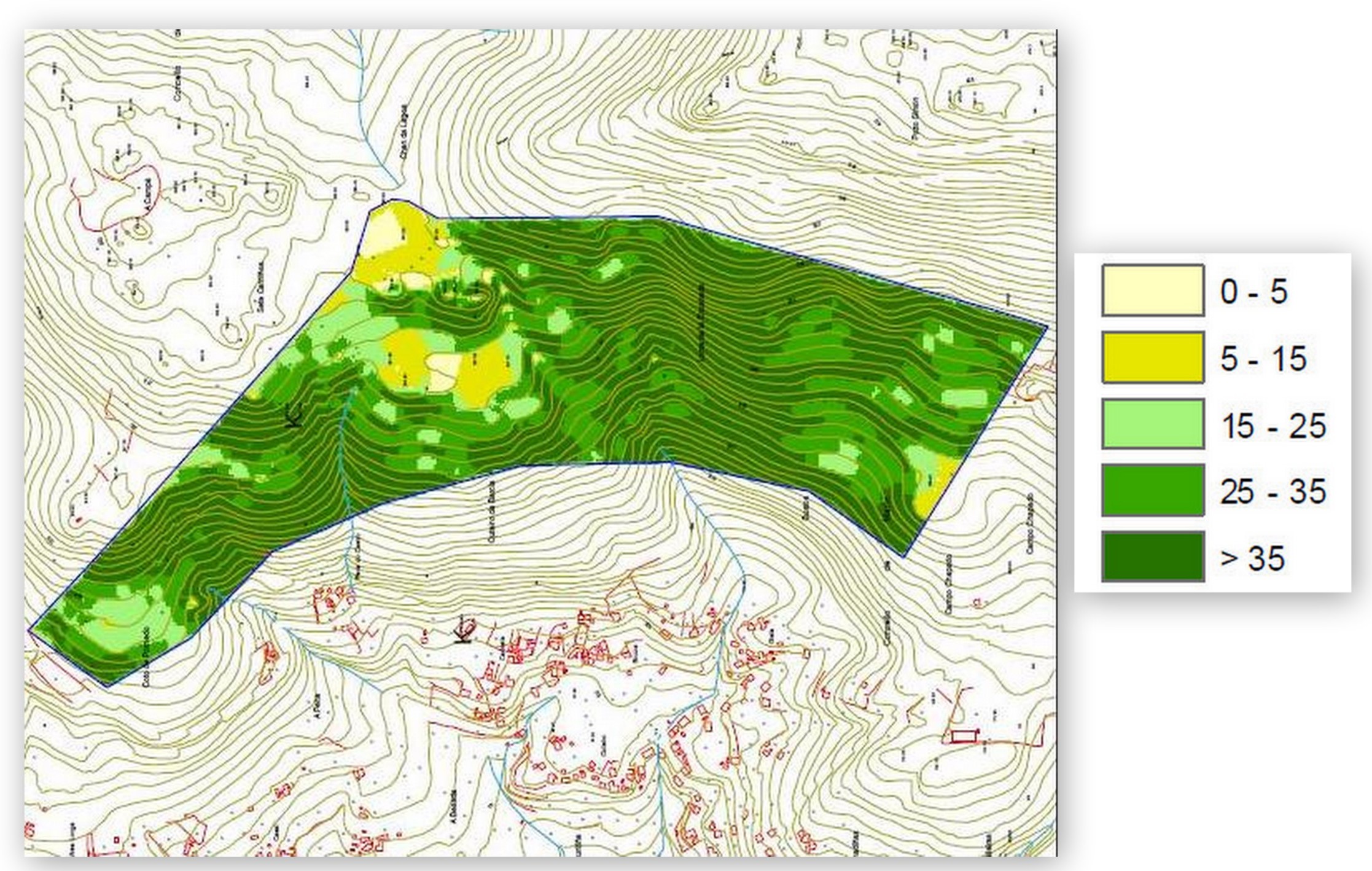 Mapa de pendentes do Monte Pituco-Pornedo onde se localizaría o suposto polígono.