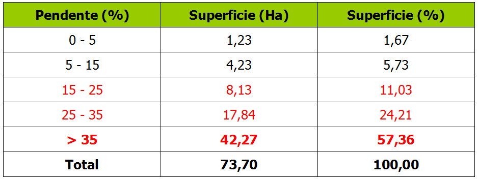 Táboa de superficies en función das pendentes no Monte Pituco (Pornedo)